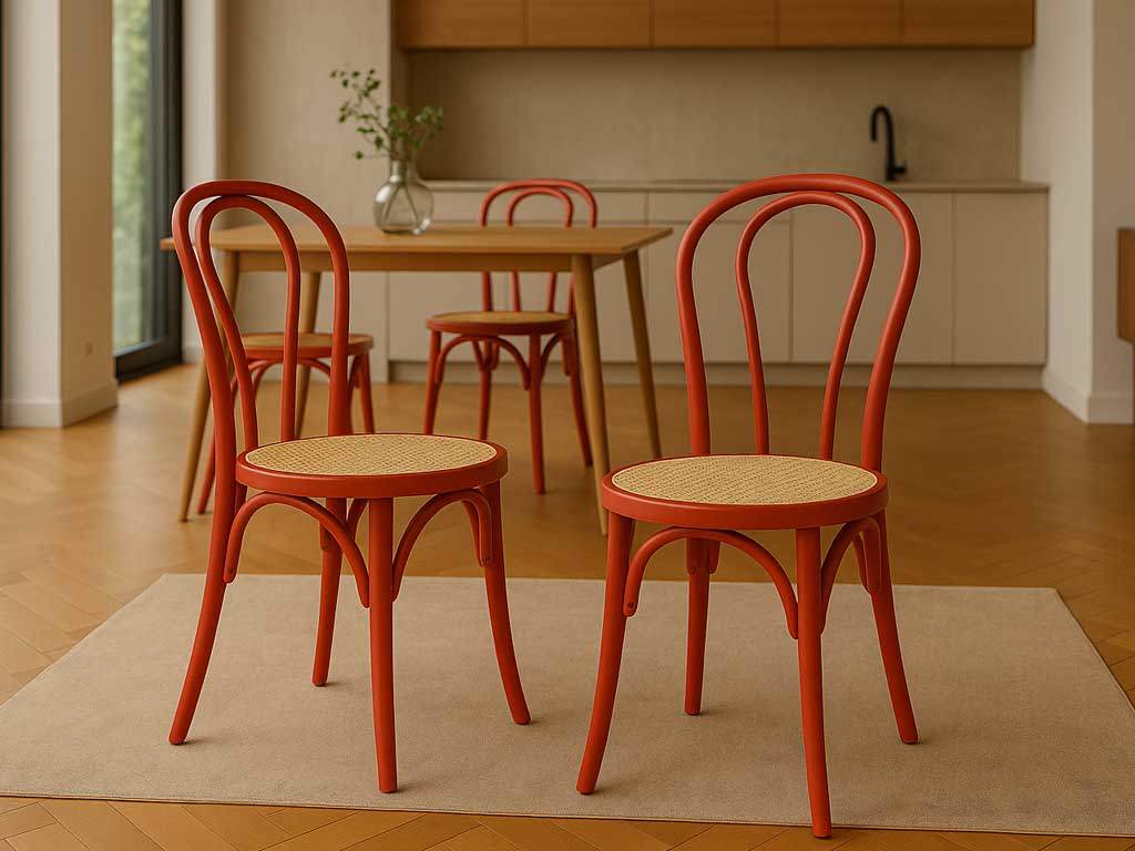 La structure de la chaise est réalisée en bois de hêtre courbé de manière élégante, tandis que l'assise est constituée de paille de Vienne.