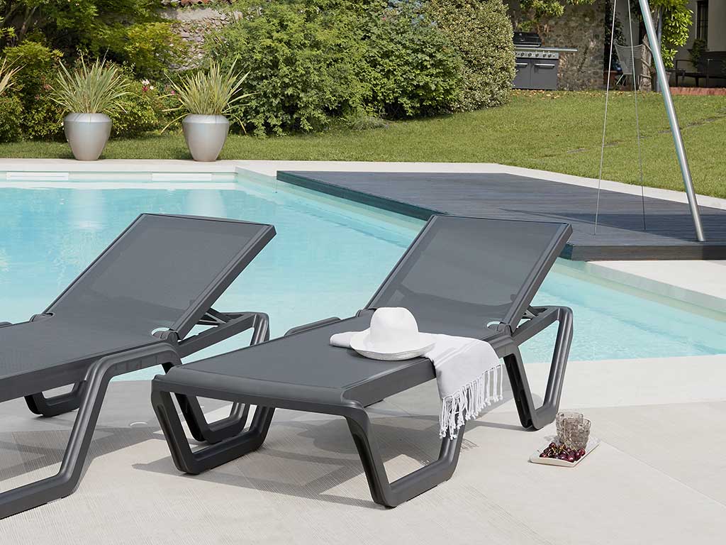 Transat avec cadre en techno polymère renforcé avec fibre de verre et tissu synthétique, transpirant, imperméable, indéformable et résistant aux rayons UV, avec dossier inclinable en 5 positions.