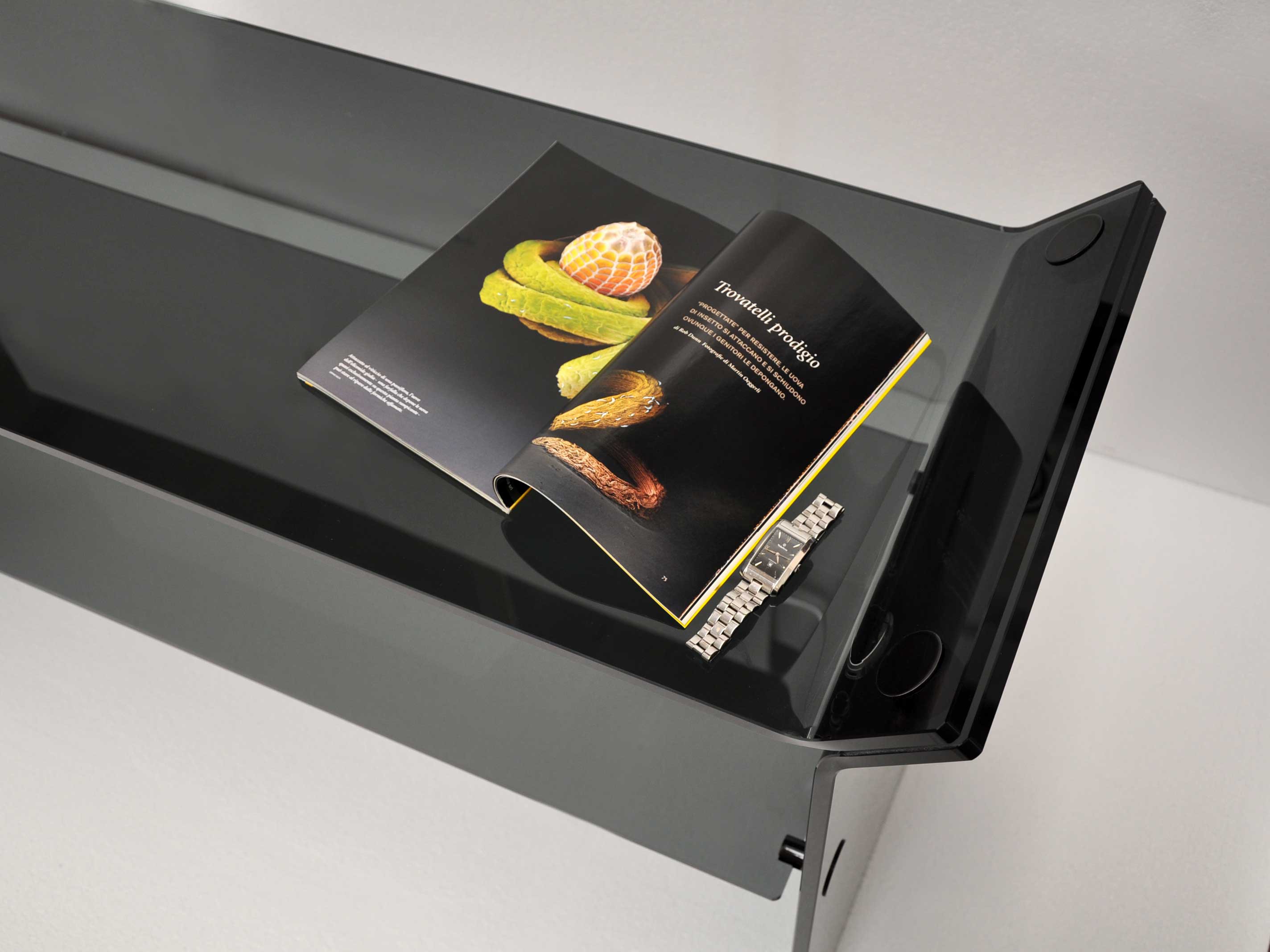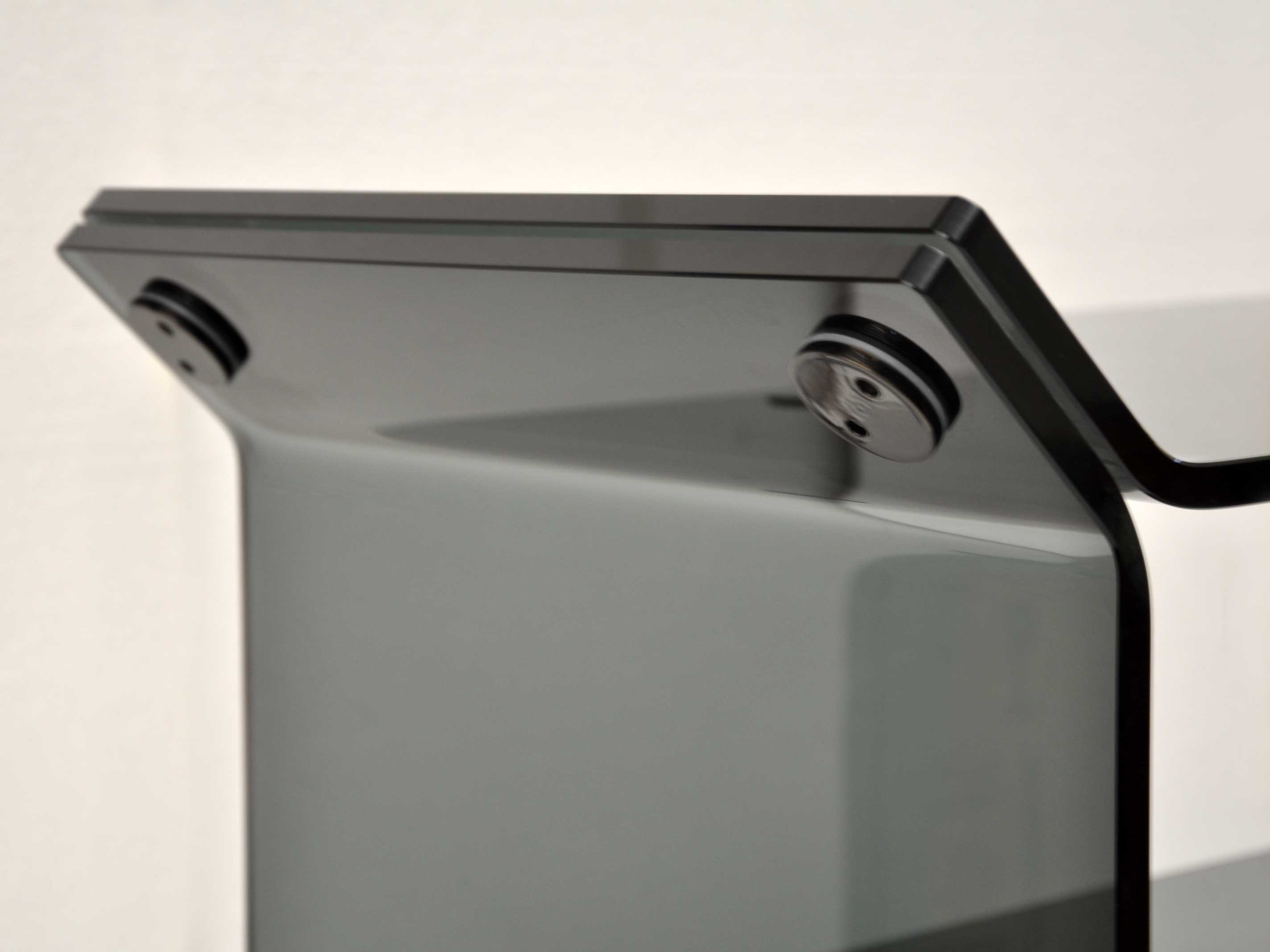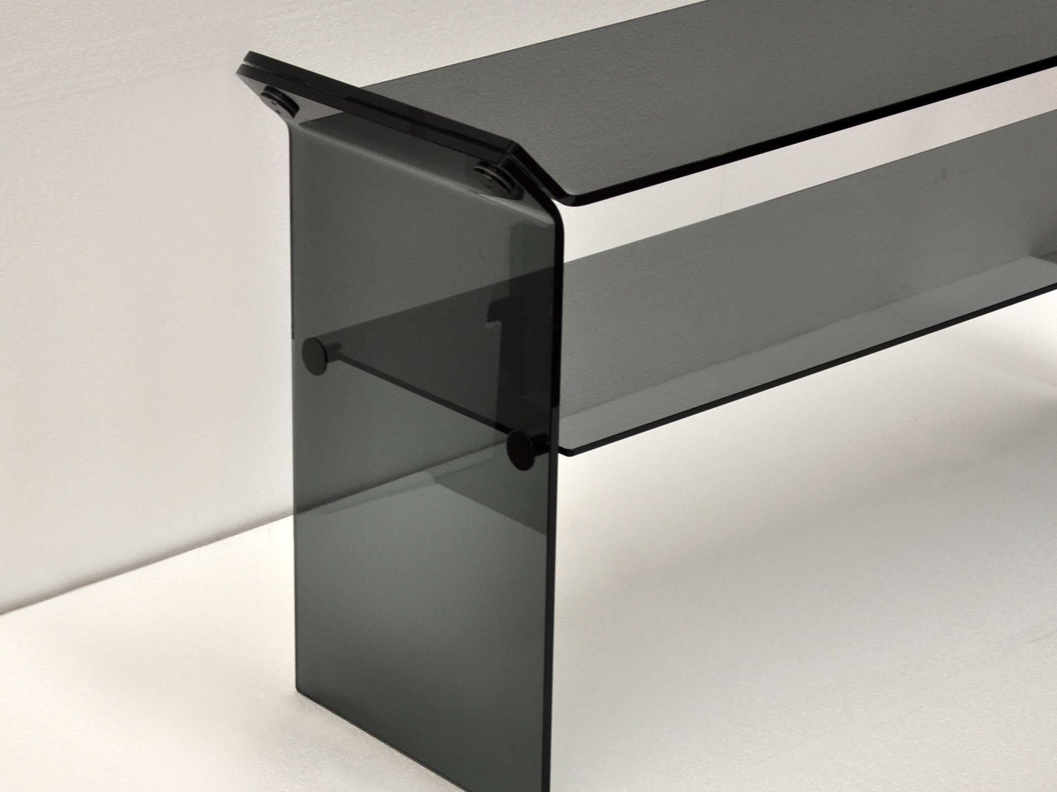 Console de salon ou de bureau en verre courbé avec 2 plans, et fixations en acier.Couleur: fumé transparent.