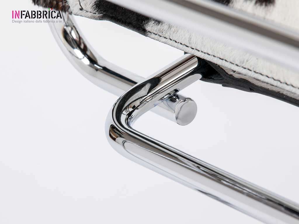 Structure en acier chromé. Assise, dossier et accoudoirs en cuir ou Pony avec extrémités soudées.