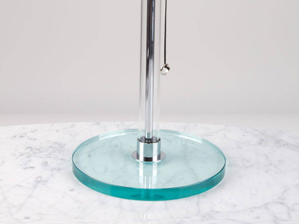 Lampada da tavolo. Base di vetro molato. Stelo in vetro tubolare con asta interna e reggivetro in nichel. Diffusore in vetro opalino soffiato su stampo di legno.