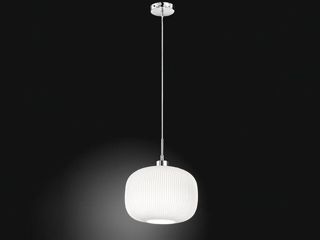 Sospensione in cromo lucido con vetro plissettato bianco, disponibile in 2 forme, ovale e cilindrica.Ideale per ambienti moderni.