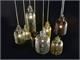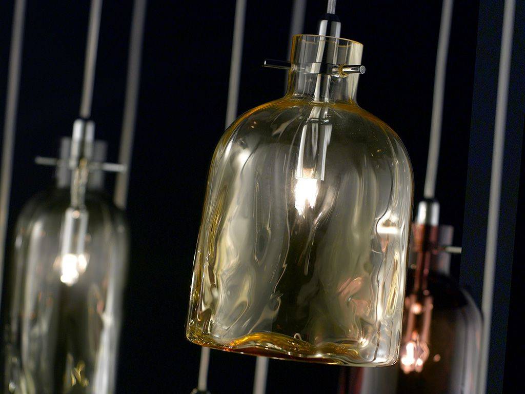 Lampada a sospensione in vetro soffiato a forma di bottiglia disponibile in vari colori e dimensioni che produce una bella luce e degli interessanti effetti cromatici.