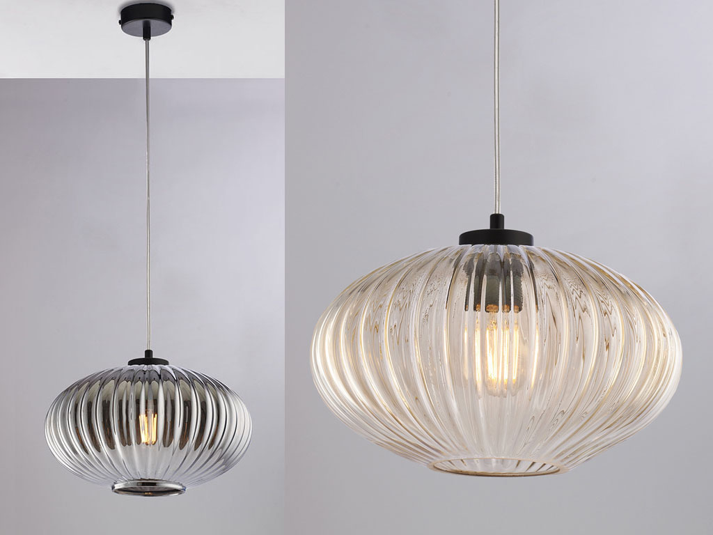 Porta un tocco di eleganza e raffinatezza ai tuoi ambienti con la lampada a sospensione in vetro soffiato, disponibile in due splendide finiture: Ambra e Grigio Specchiato.
