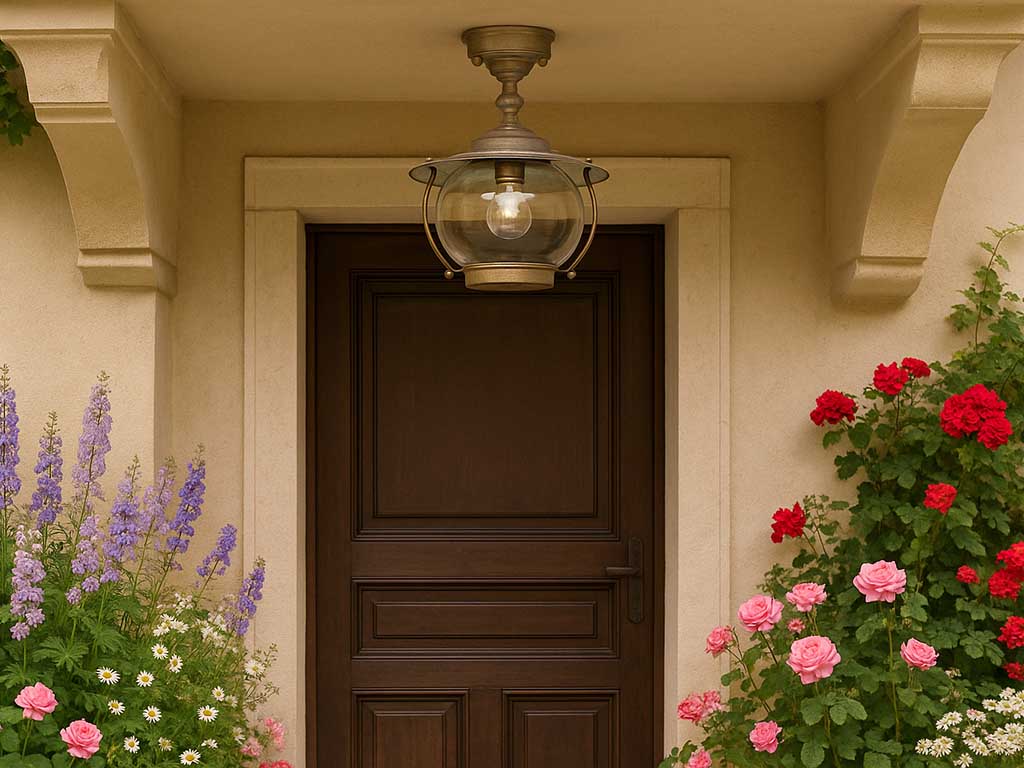 Plafoniera da esterno, struttura in ottone, ideale per illuminazione case al mare, case in campagna o come illuminazione case centro storico o di valore storico.