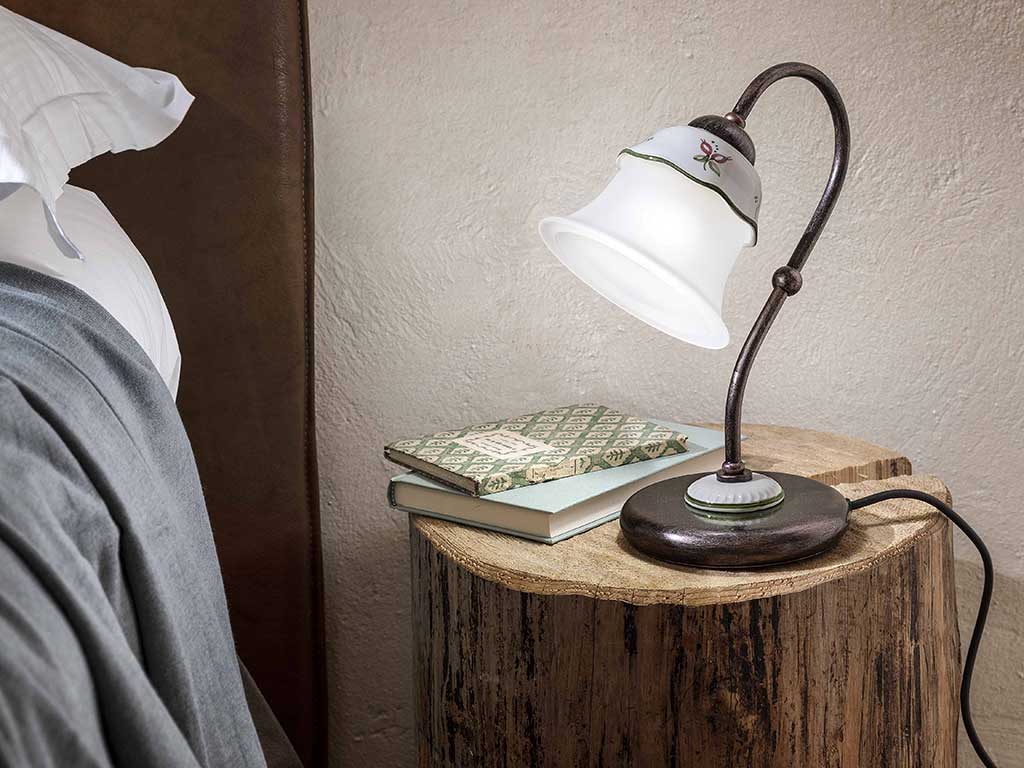 Abatjour in ceramica bianca decorata e paralume in vetro satinato , con colori netti e superfici lucide, per un arredamento classico.