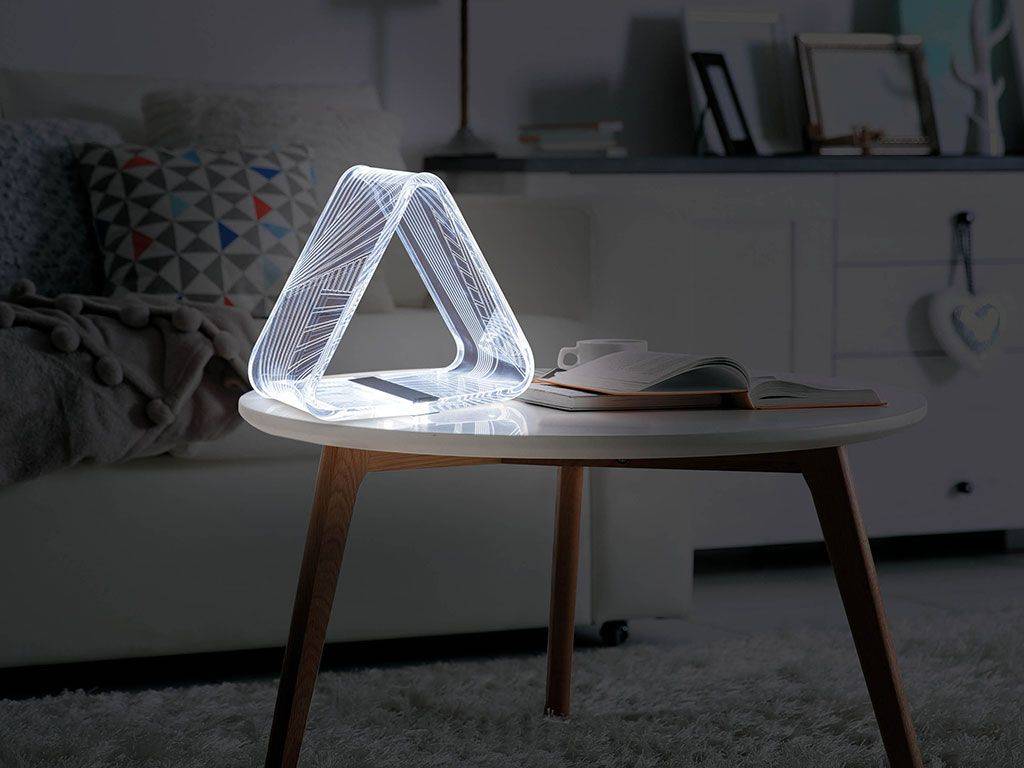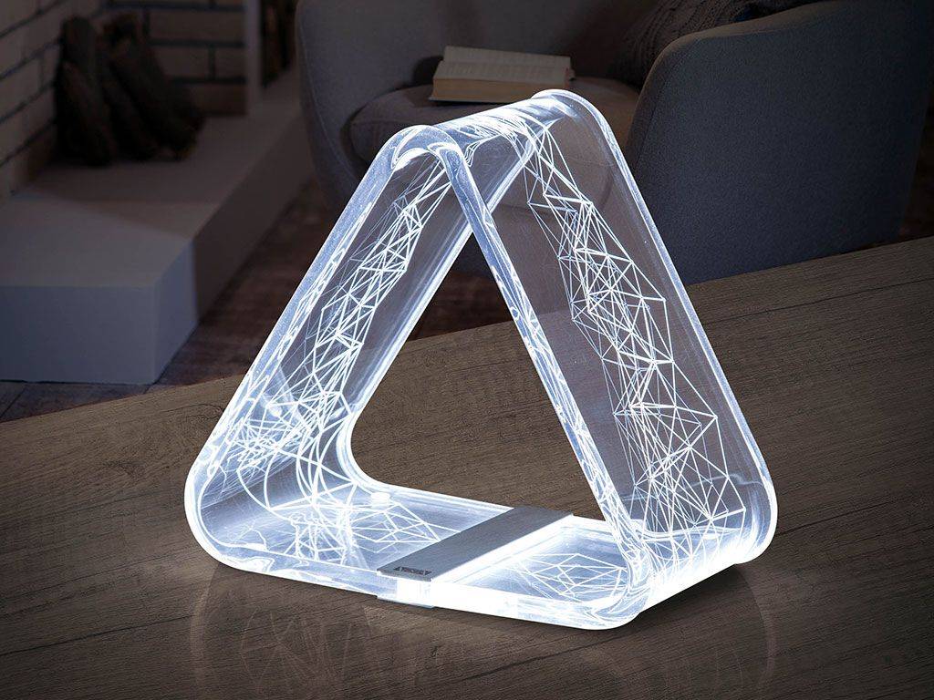 Lampada LED da tavolo a forma triangolare in cristallo acrilico (Plexiglass) con inserti di prismi o vettori. Ottima come idea regalo, ideale come lampada da tavolino o comodino.