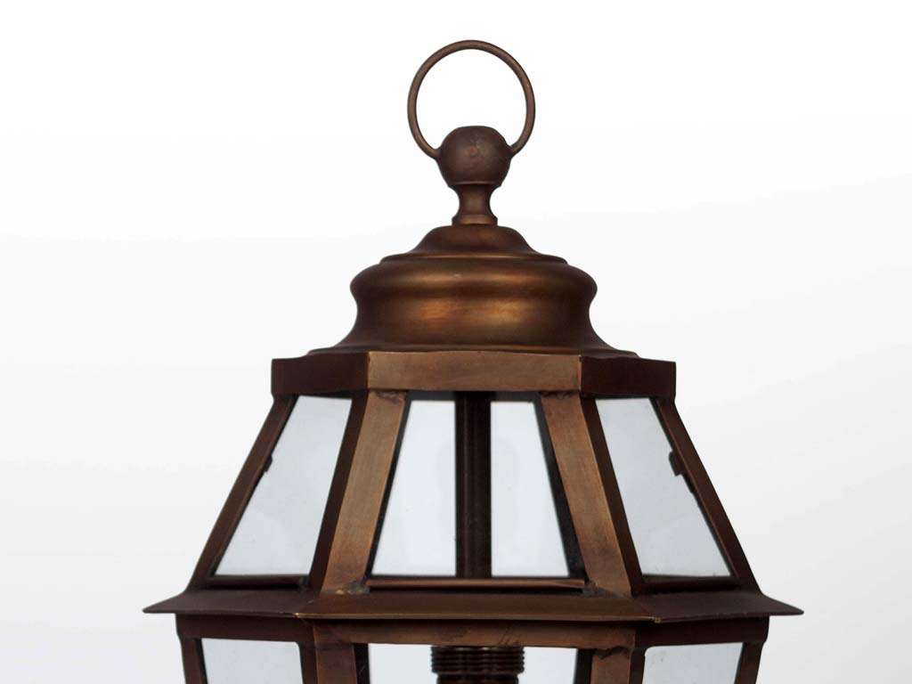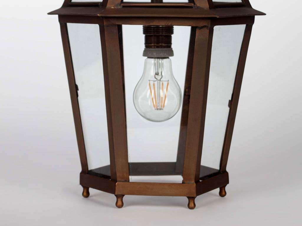 L’ottone brunito è protagonista di questa lanterna dallo stile rinascimentale che richiama il gusto dell’illuminazione a candela. L’unicità del design la rende una lampada da architettura classica oltre che un punto luce decorativo.