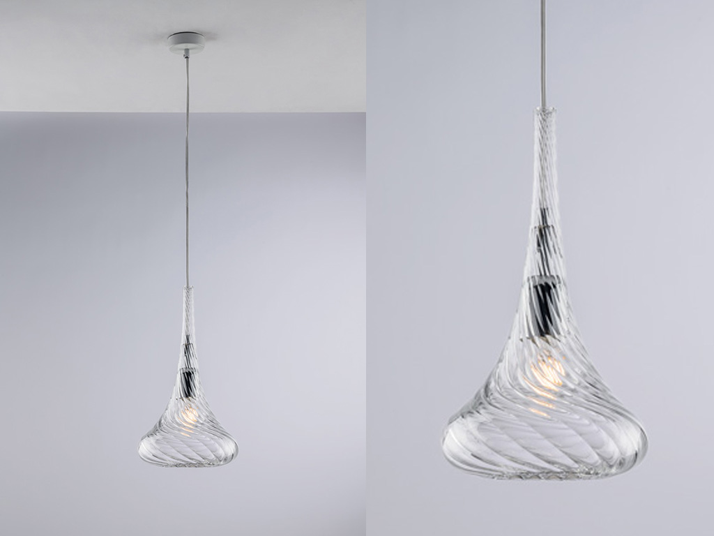 Questa lampada a sospensione in vetro soffiato è un vero elemento di design: la trasparenza del materiale e il movimento del vetro lavorato a spirale creano una luce unica, capace di trasformare l’atmosfera della stanza.