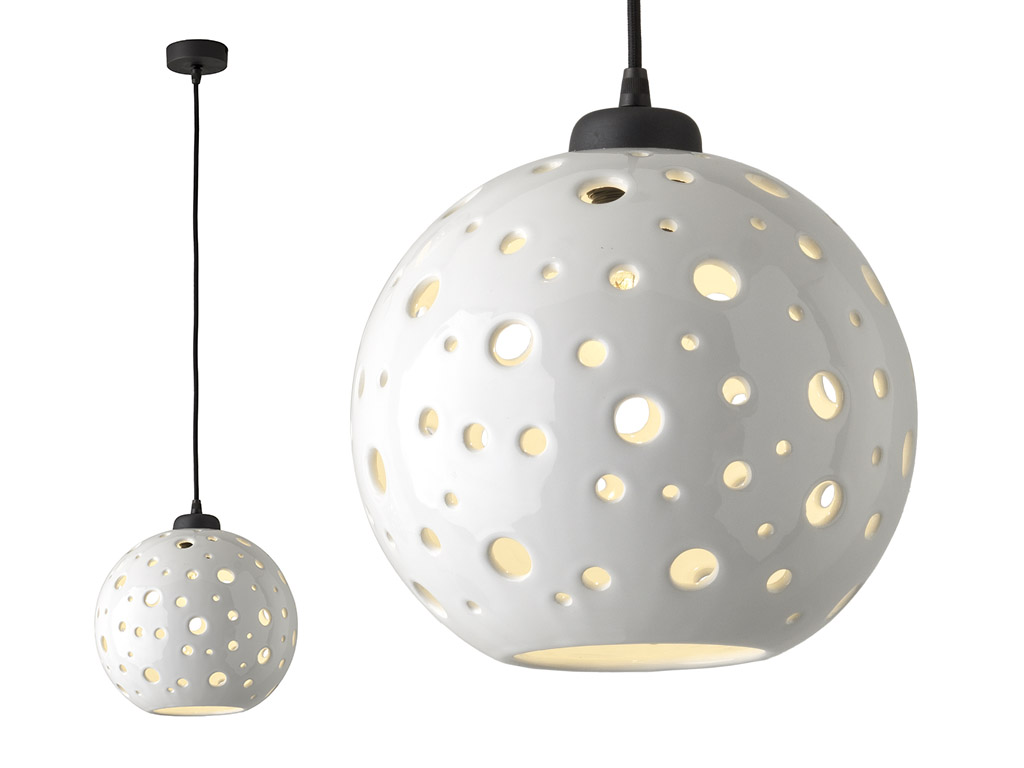 Il paralume sferico in ceramica bianca è traforato con fori di diverse dimensioni. La luce passa attraverso i fori creando giochi di luce e ombra suggestivi.