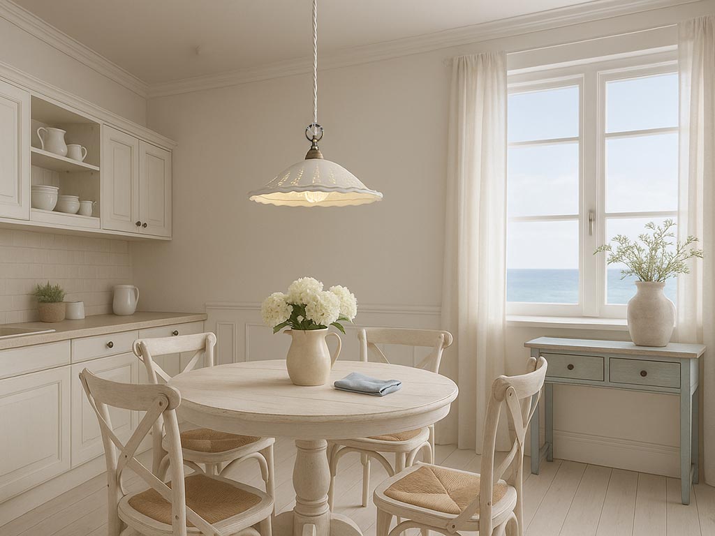 Se ami l’arredamento romantico e raffinato, il lampadario shabby chic in ceramica è la scelta ideale. La luce calda e avvolgente crea un’atmosfera intima sopra il tavolo da pranzo, valorizzando il cuore della tua cucina.