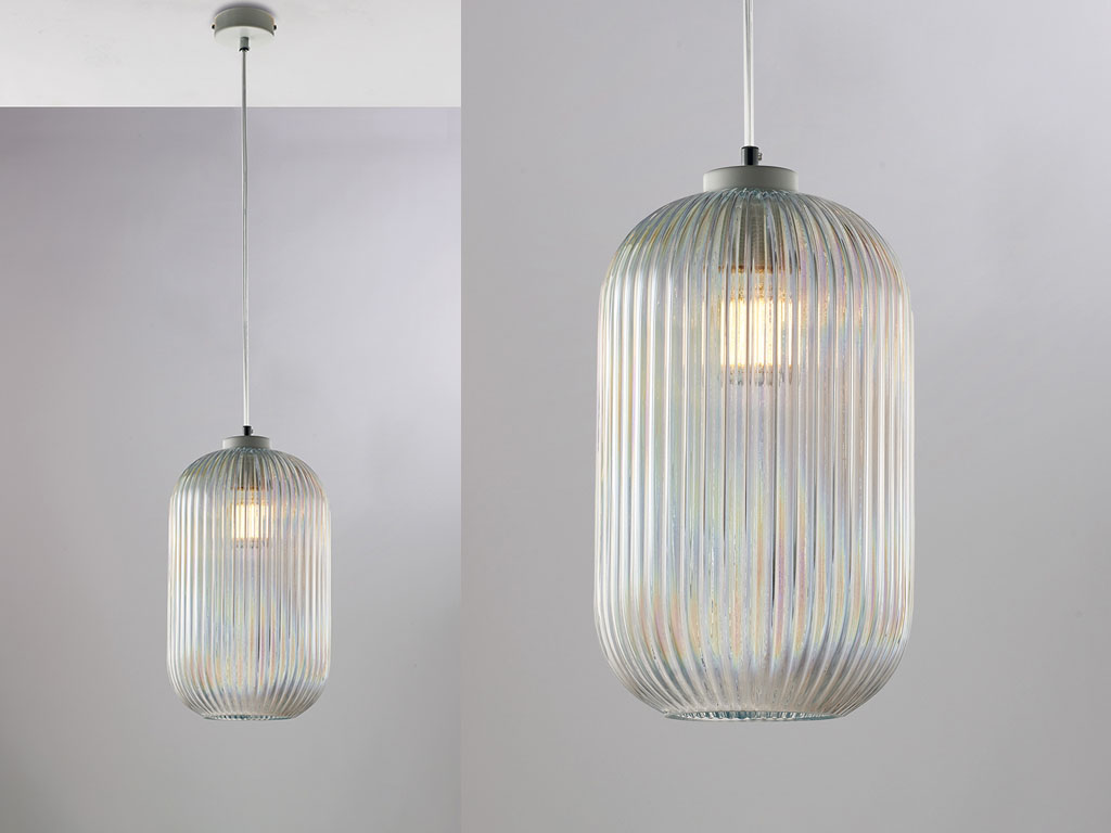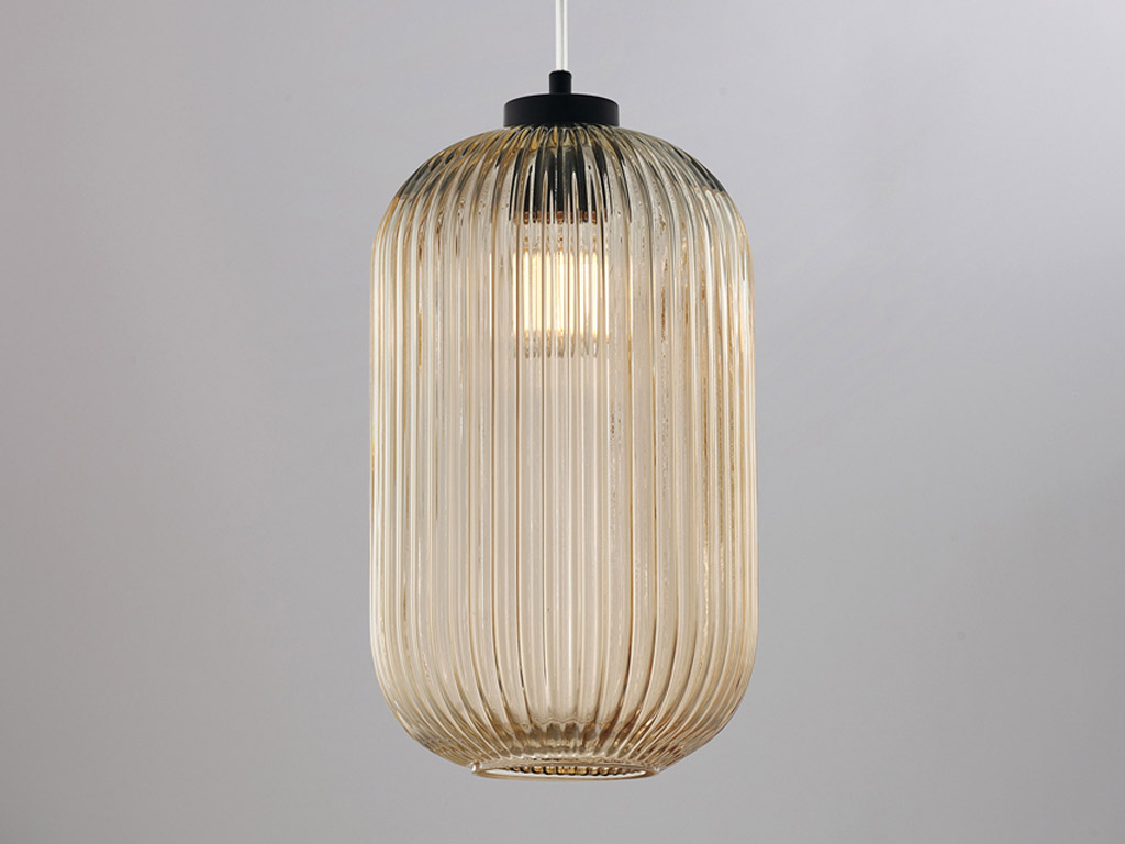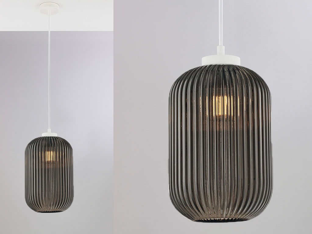 Disponibile nelle tre varianti di vetro Ambra, Grigio Specchiato e Trasparente, questa lampada si distingue per la rigatura in rilievo del paralume, che crea un suggestivo gioco di riflessi e trasparenze, valorizzando ogni spazio con una luce calda e accogliente.