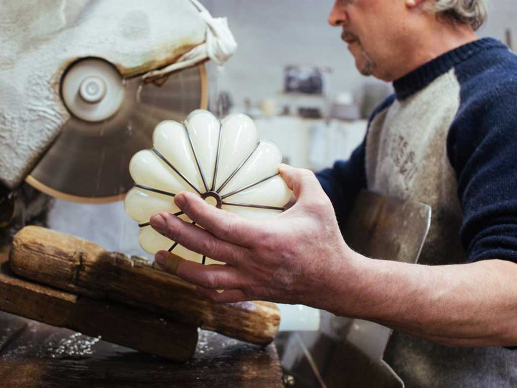 Il vetro, soffiato dal maestro vetraio all’interno della nella montatura di acciaio inox, si gonfia sagomandosi fino ad assumere la forma desiderata.