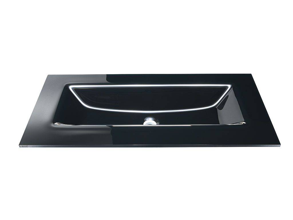 Lavabo in vetro curvato con vasca centrale a forma rettangolare.