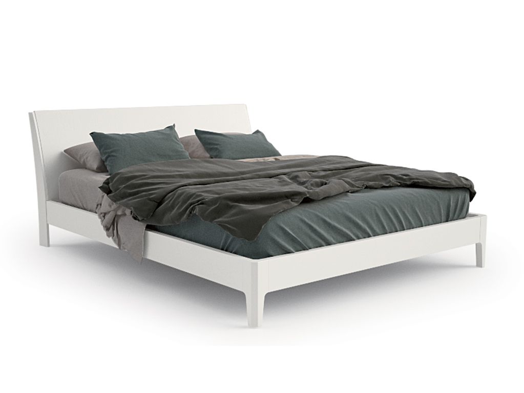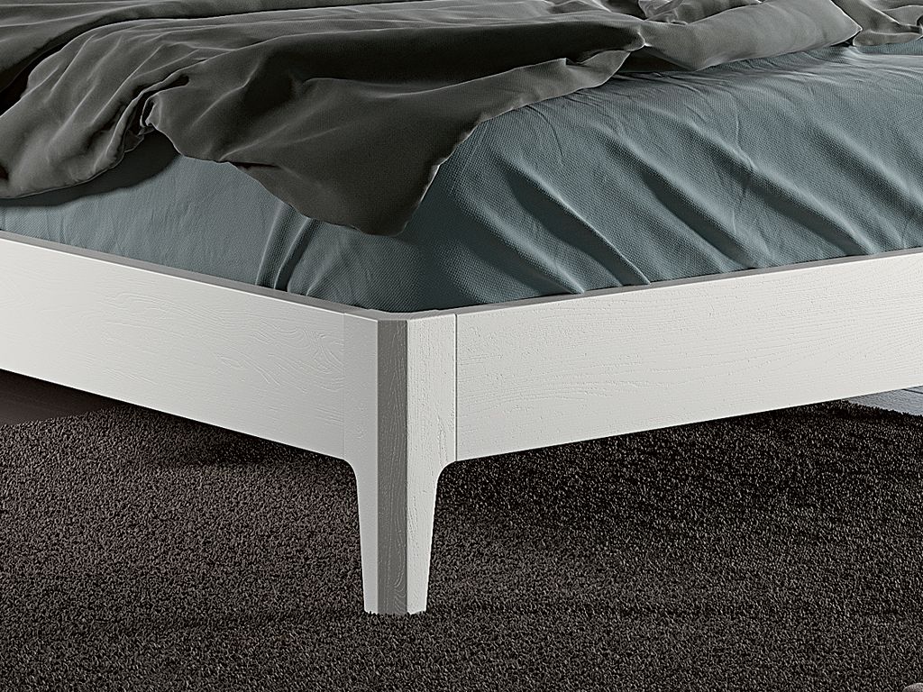 Letto matrimoniale con montanti testiera e giroletto in legno massello e pannello testiera impiallacciato, disponibile in diverse finiture legno o colori laccati opachi lisci (specificare in fase d'ordine il colore laccato desiderato).Proposto nella versione senza contenitore o su richiesta con box contenitore ad apertura standard.