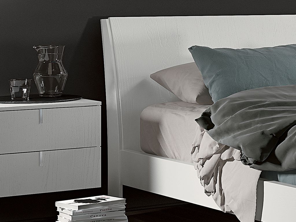 Realizzato in legno massello, verniciato nei colori laccati e legno a poro aperto. Pannello testiera curvo in spessore 22 mm. impiallacciato.