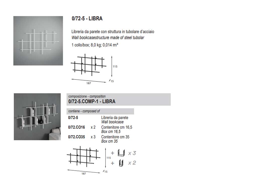Libreria con struttura in tubolare d’acciaio (a sezione quadrata) disponibile con 2 contenitori in metallo da 16,5 e 3 da 35 cm o senza contenitori.