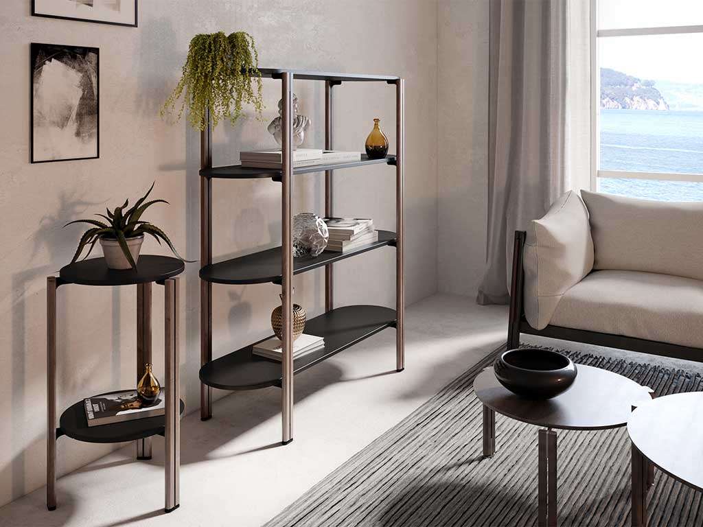 La libreria bassa è disponibile in due altezze e in diverse finiture legno e metallo. Nella versione più compatta, si adatta perfettamente come libreria dietro divano, soluzione pratica per sfruttare lo spazio in modo elegante e funzionale. Nella versione più alta offre più capienza con quattro ripiani.