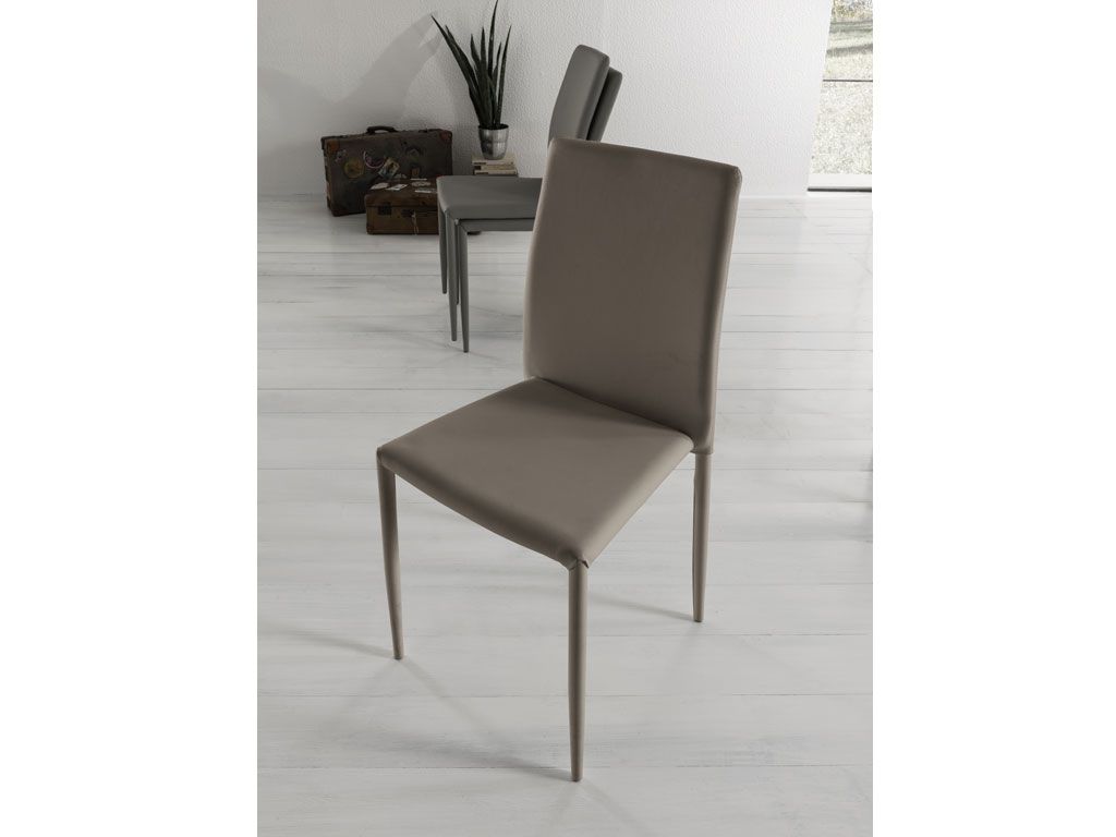 Sedia impilabile con struttura in metallo completamente rivestita in ecopelle nei colori: bianco, cappuccino, grigio tortora, antracite.