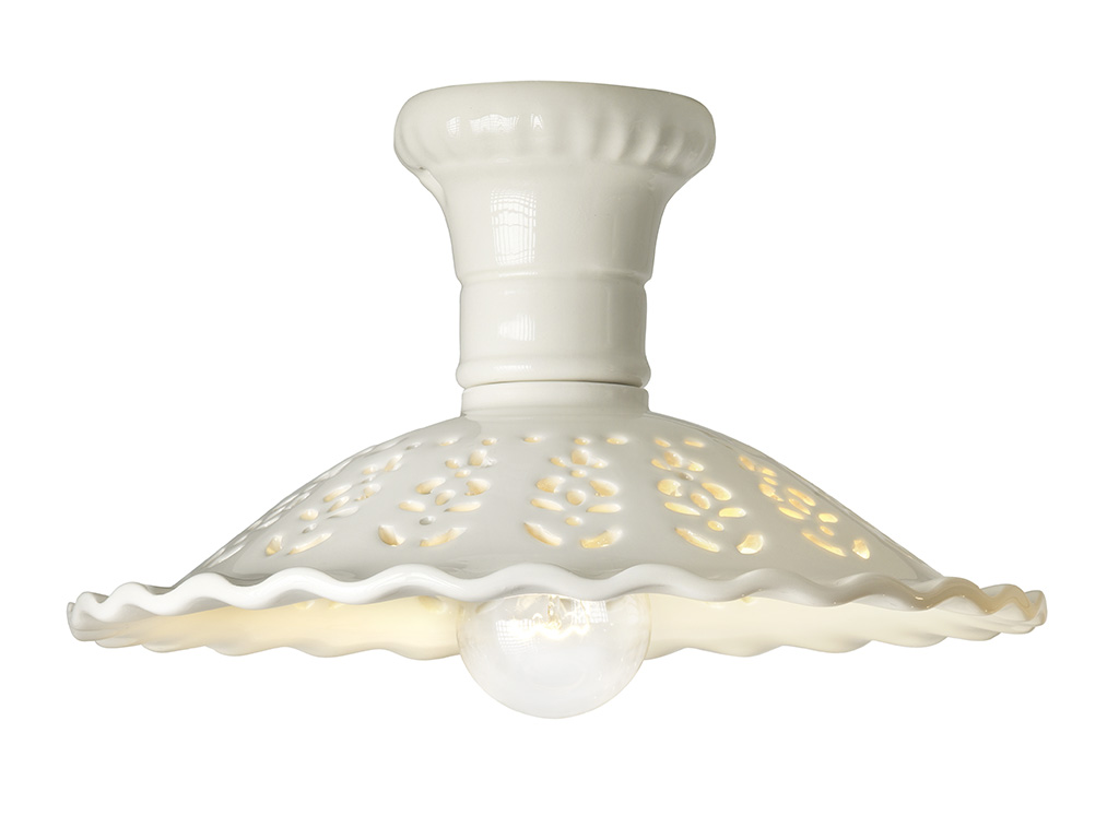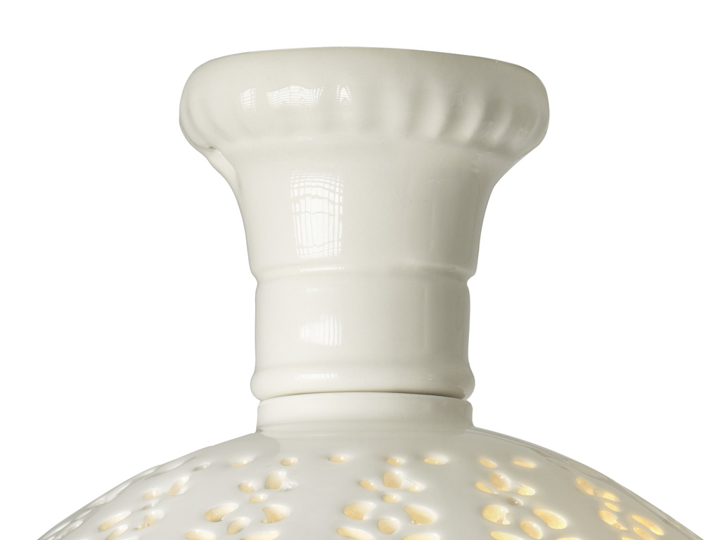 Il diffusore in ceramica ha un bordo ondulato e trafori decorativi che creano giochi di luce delicati.