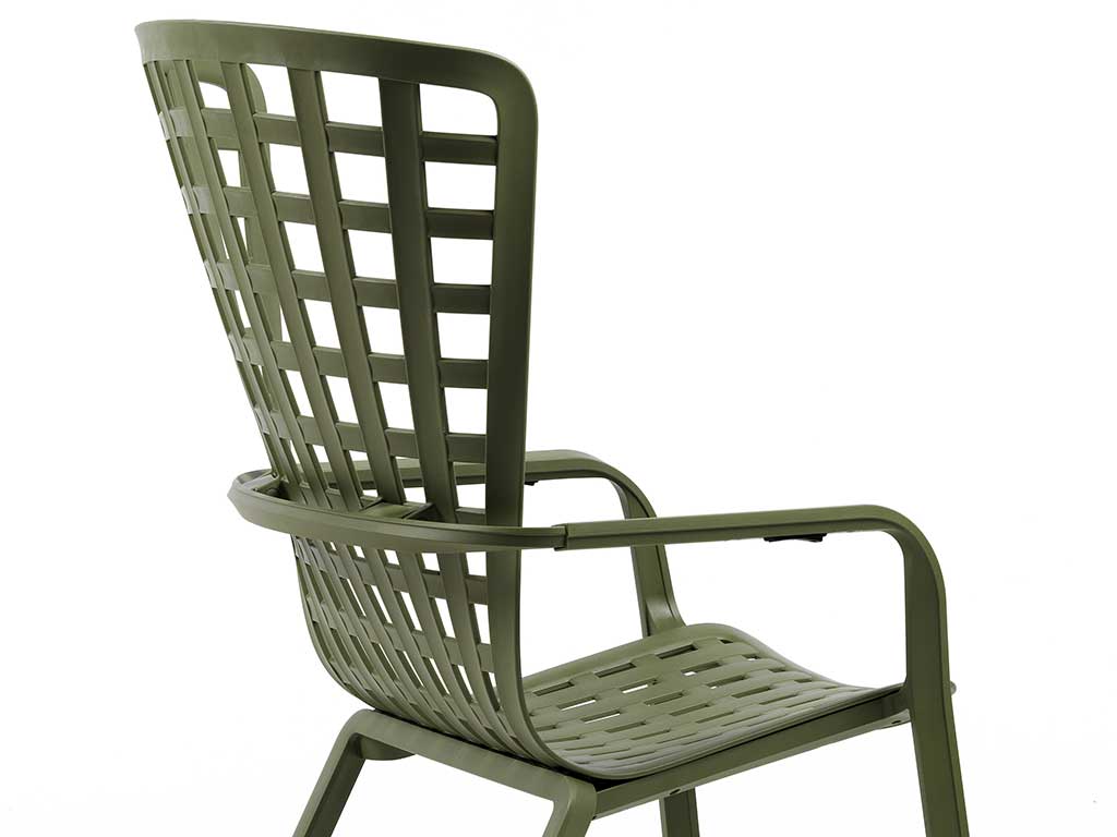 poltrona relax reclinabile per l’outdoor realizzata in resina fiberglass traforata con motivi a quadri e finitura opaca.