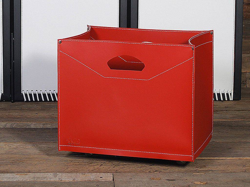 Borsa porta legna in cuoio, base a terra in legno con ruote gommate.