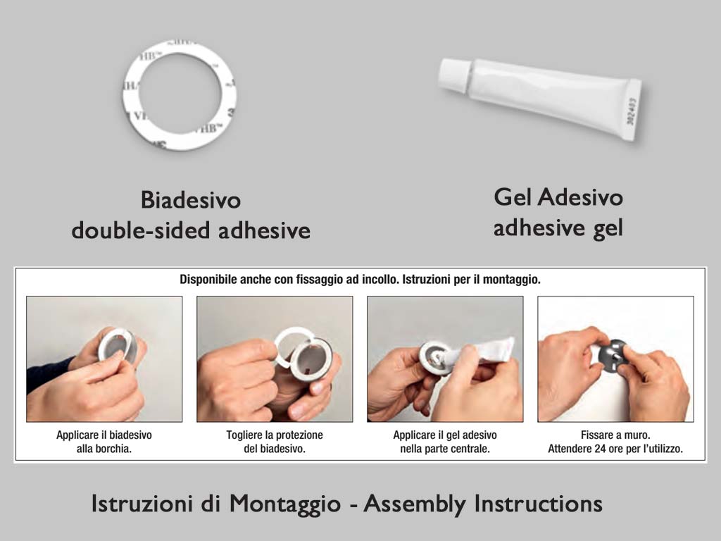 Sistema di fissaggio a incollo o a tasselli a scelta incluso nella confezione.