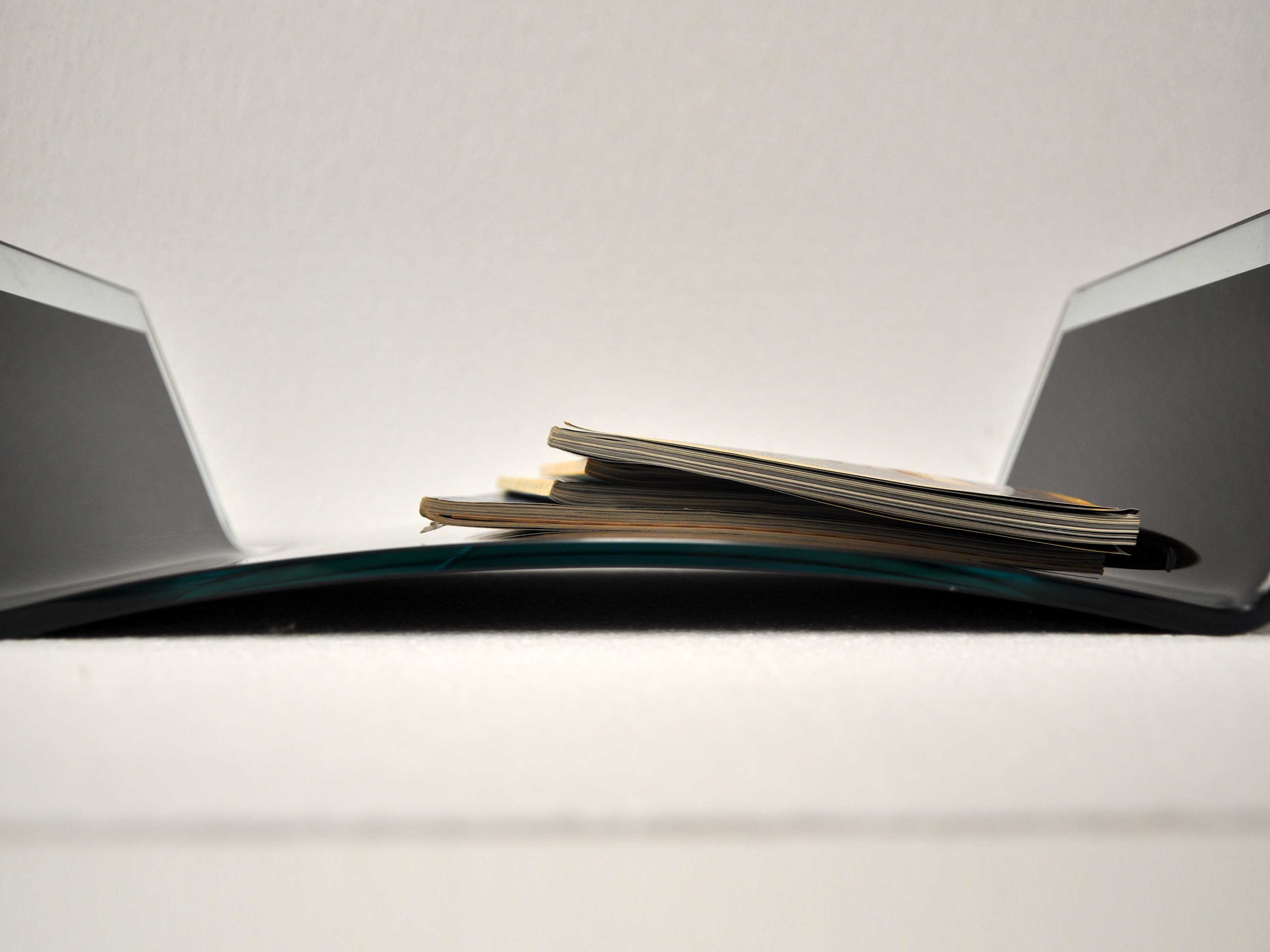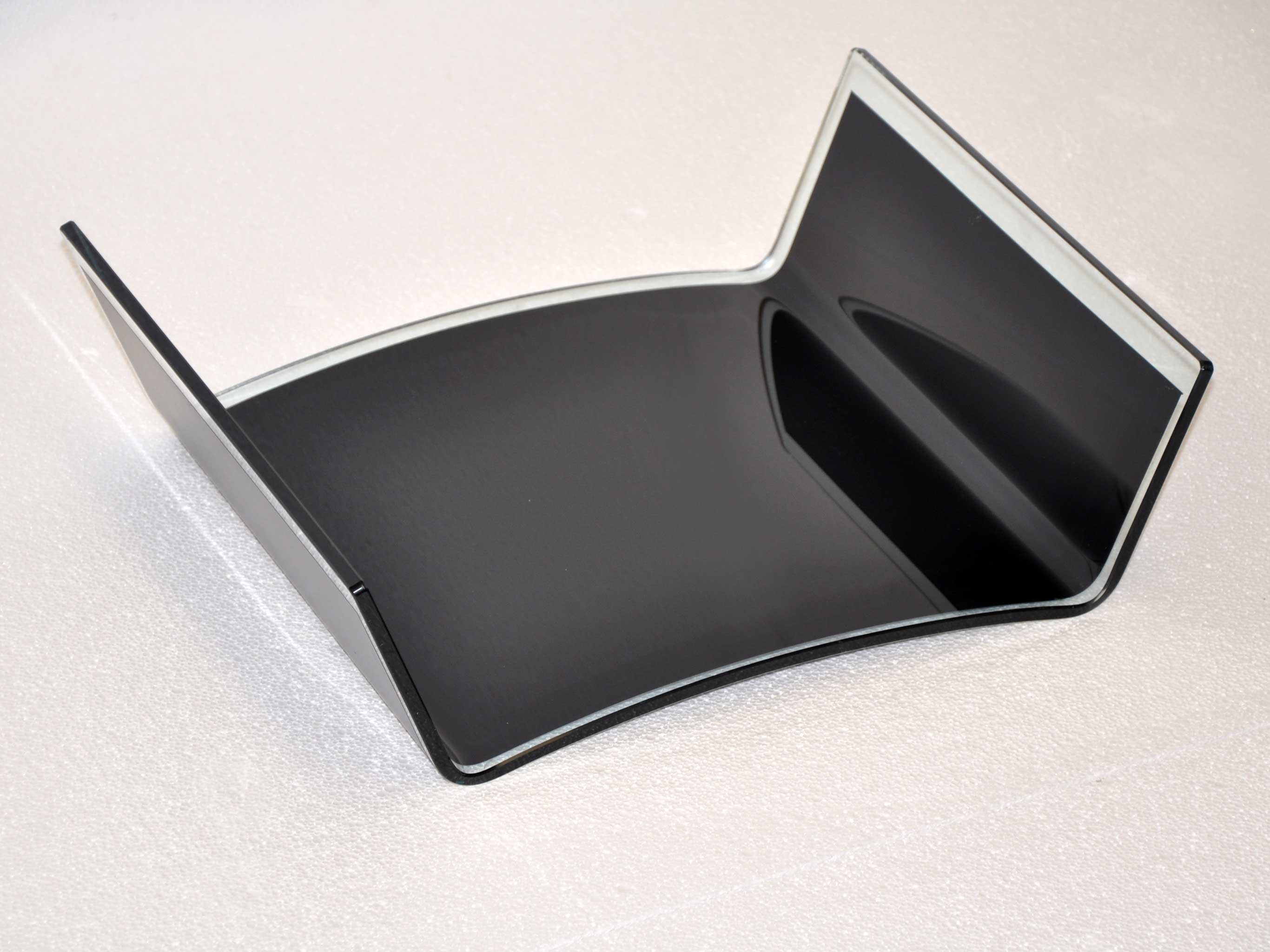 Porta riviste in vetro curvato, con retro verniciato nero e cornice trasparente.