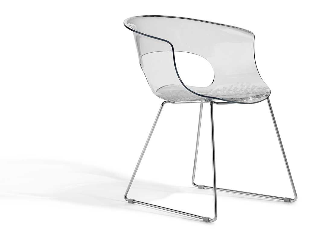 Sedie design, sedie moderne design, poltroncine design, ideali come sedie da cucina moderne o sedia ufficio design. Scocca in policarbonato, struttura a slitta in tondino d'acciaio ø 11mm cromato. Disponibile nei colori trasparente, bianco.