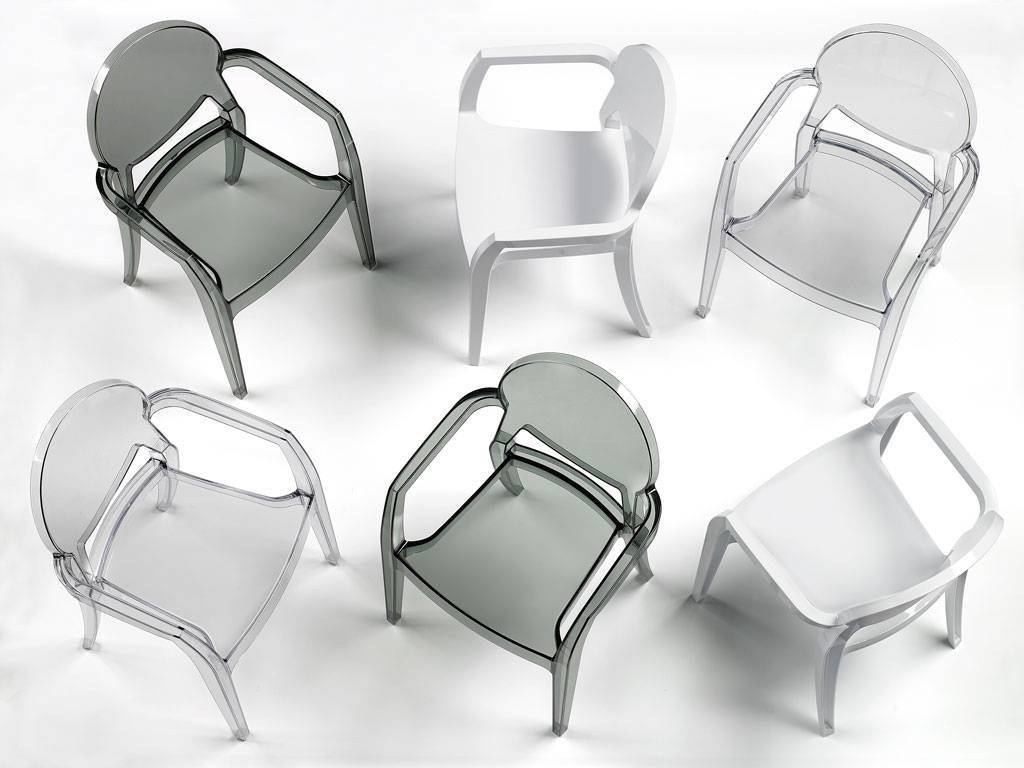 La scocca presenta un decoro nella zona di contatto che interagisce con la luce e crea piccoli effetti cromatici. La seduta è comoda e sostiene la schiena. I braccioli aiutano il comfort senza appesantire il profilo. Le finiture disponibili coprono esigenze diverse: bianco pieno, nero pieno, trasparente, trasparente fumé. Le versioni trasparenti ampliano visivamente lo spazio. Le versioni piene creano contrasti moderni con tavoli in legno o metallo.