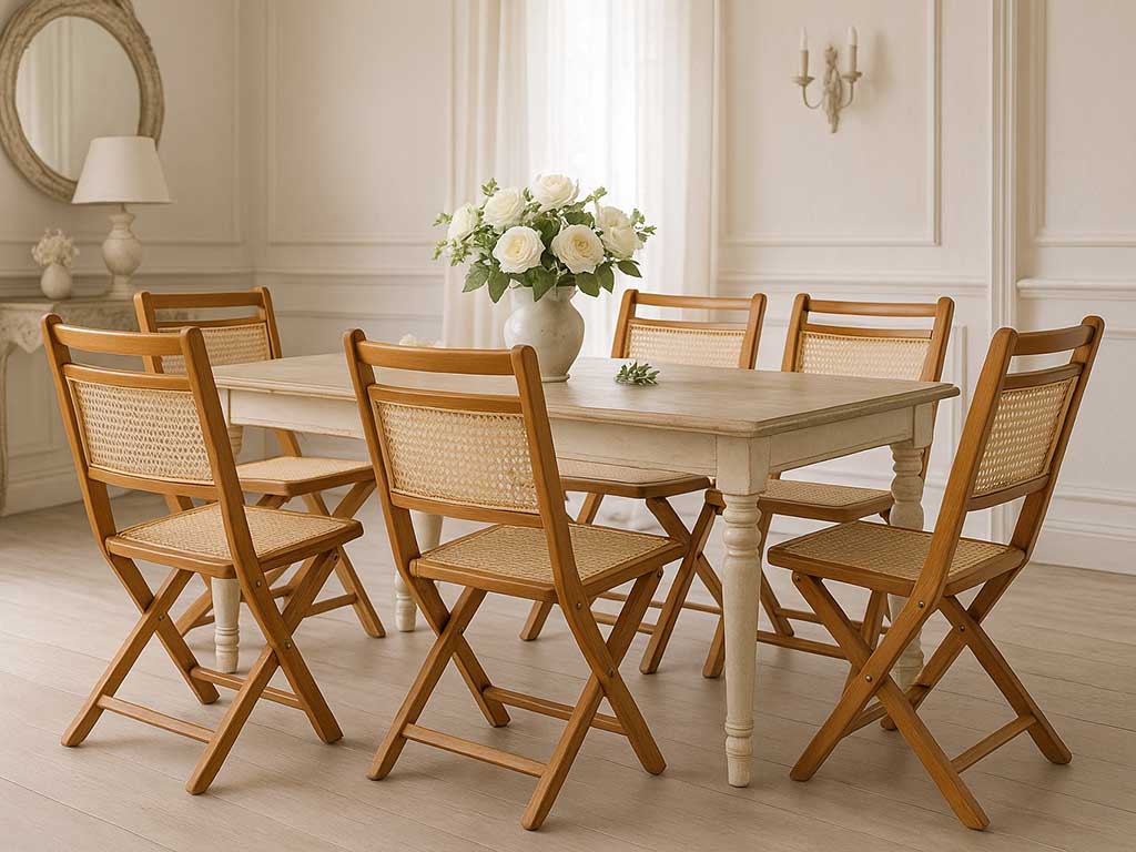 Sedia pieghevole vintage legno, struttura in legno massello di faggio, sedile e schienale in paglia di Vienna. Ideale come sedia elegante e salva spazio.