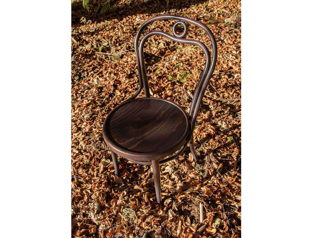 La presenza di un anello realizzato in legno curvato, inserito nello schienale, racconta tutta l'abilità e la maestria degli artigiani che l'hanno realizzata, con la tecnica antica della curvatura a vapore, sapientemente fatta a mano, un pezzo alla volta.