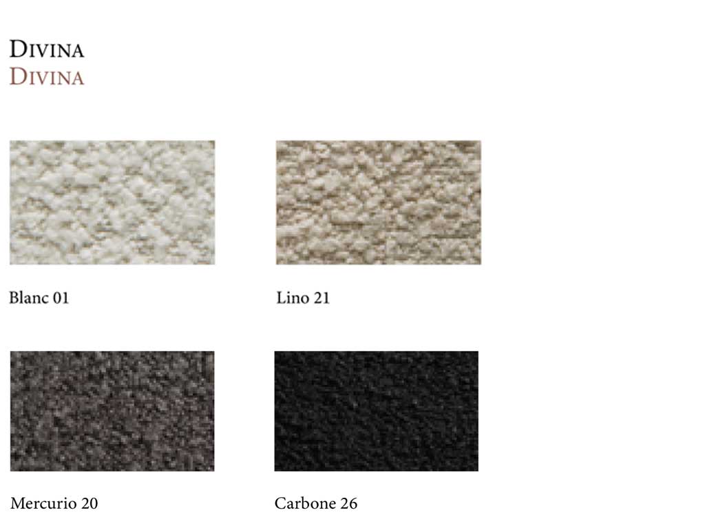Il tessuto Divina è caratterizzato da una mano morbida e avvolgente, composta da filati di diversa natura, tra cui spicca una preziosa bouclette di lana di Alpaca. Questo materiale pregiato, proveniente dal Perù e filato in Italia, dà vita a un Bouclé soffice, materico e raffinato. La luce lo attraversa in modo delicato, creando giochi d’ombra che sembrano pennellate sulla superficie: un intreccio naturale e armonioso di eleganza e comfort.