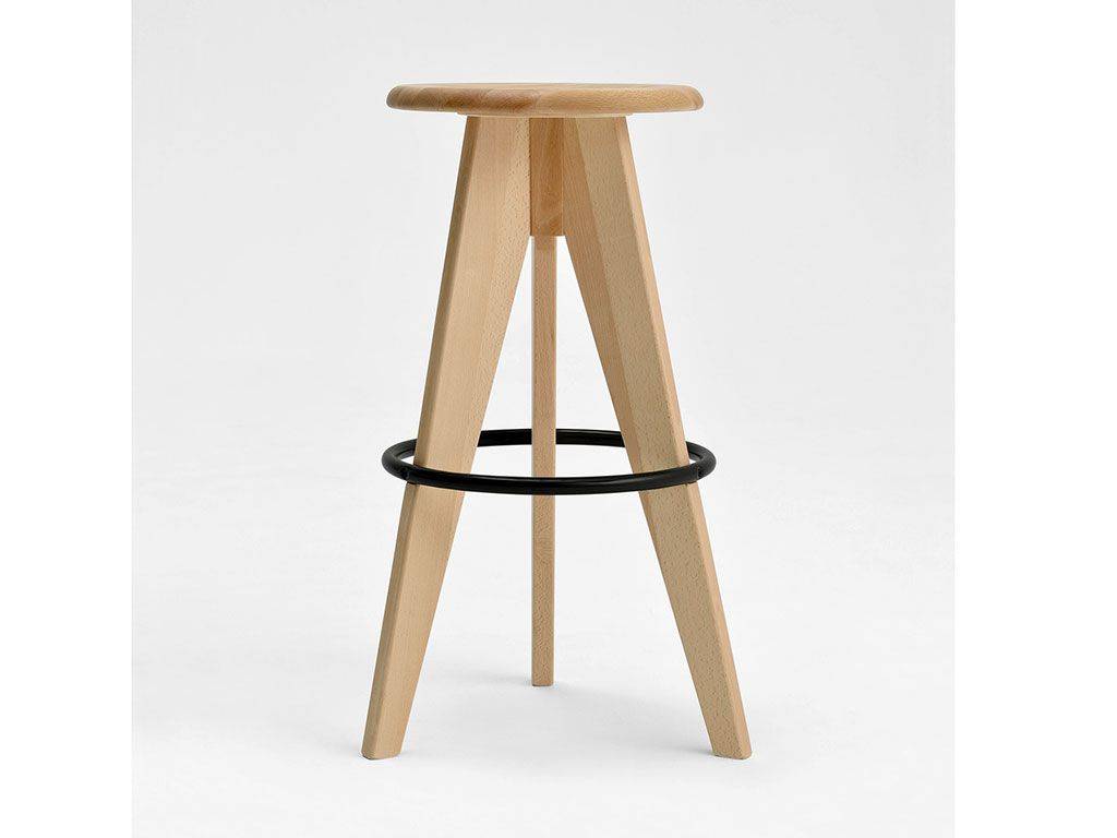 Sgabello treppiede interamente in legno massello, di forma circolare, con anello poggiapiedi e piedini.