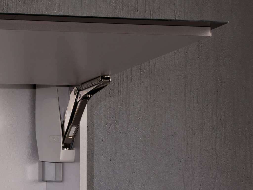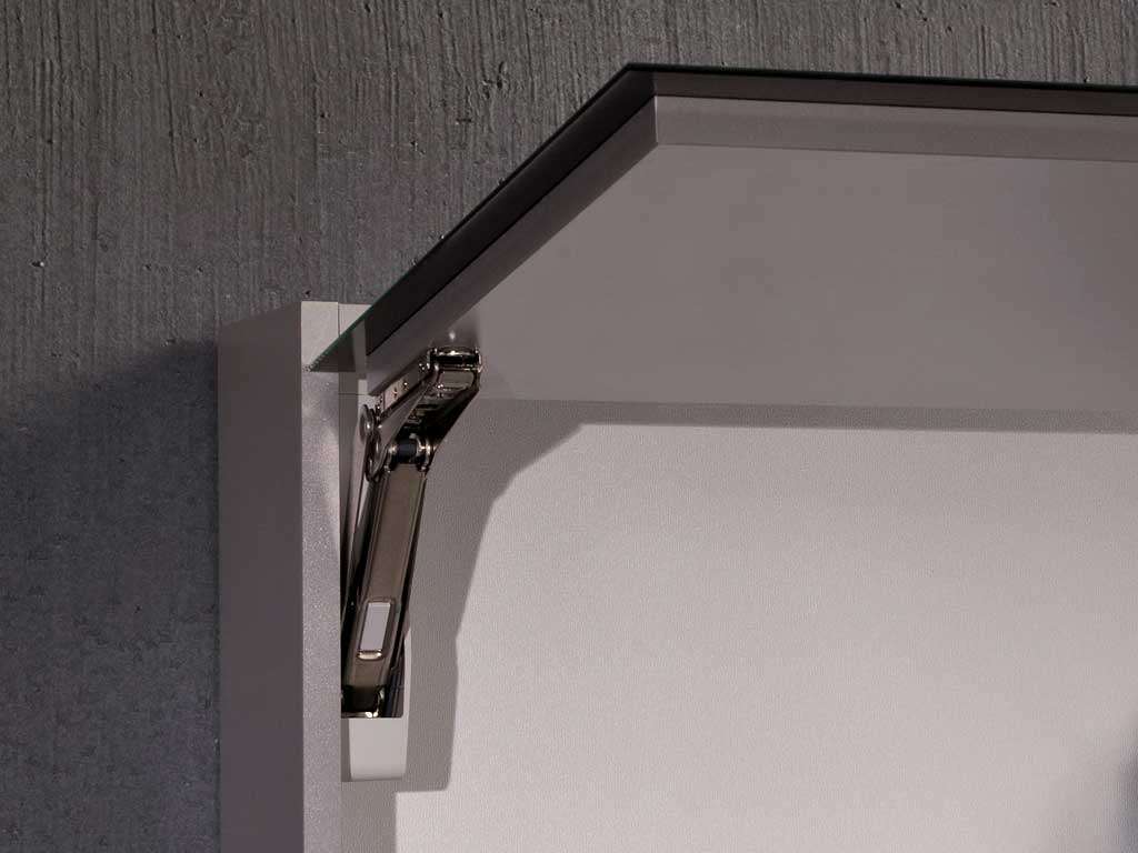 Specchio bagno con luce, dotato di un'anta basculante ad apertura assistita, di una mensola in cristallo interna e di un box contenitore con supporti di fissaggio autobloccanti.