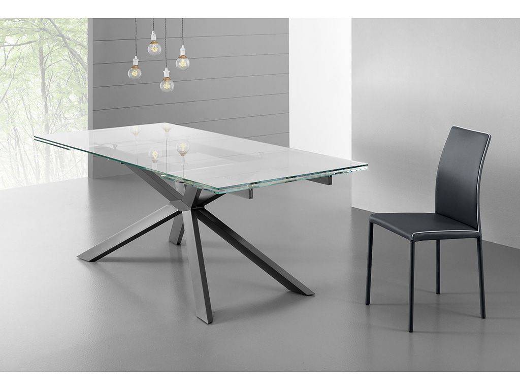 Osaka è un tavolo allungabile, completo di meccanismo con piano in vetro, perfetto per tutti i tipi di arredo, dotato di due prolunghe su guide telescopiche.