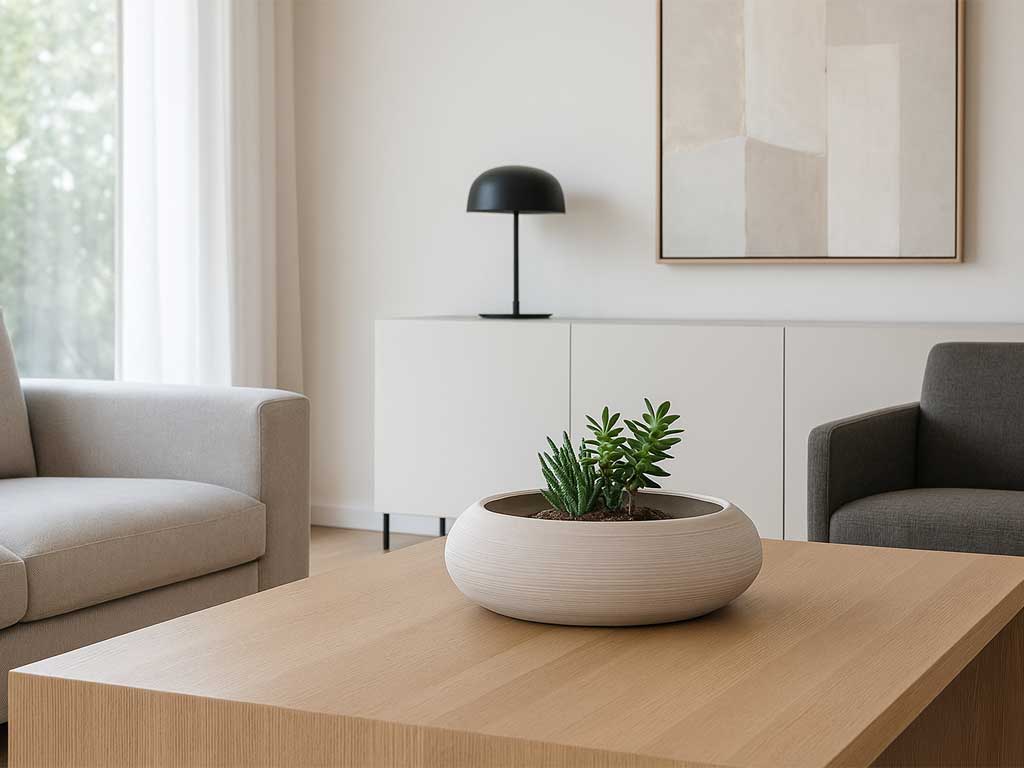 Può essere utilizzato come centrotavola su tavoli da pranzo o salotti, dove aggiunge un tocco di raffinatezza e naturalezza, oppure come vaso per piante grasse, fiorite o bonsai, ideale per ambienti luminosi e moderni.