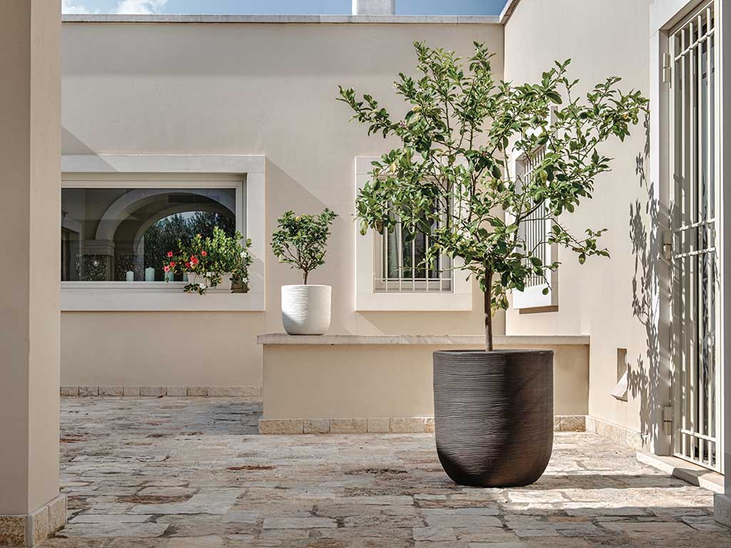 Robusto ma leggero, è ideale per contenere piante da interno e da esterno – come ulivi, ficus, agrumi, piante grasse o fiorite – creando composizioni armoniose e di grande effetto estetico.