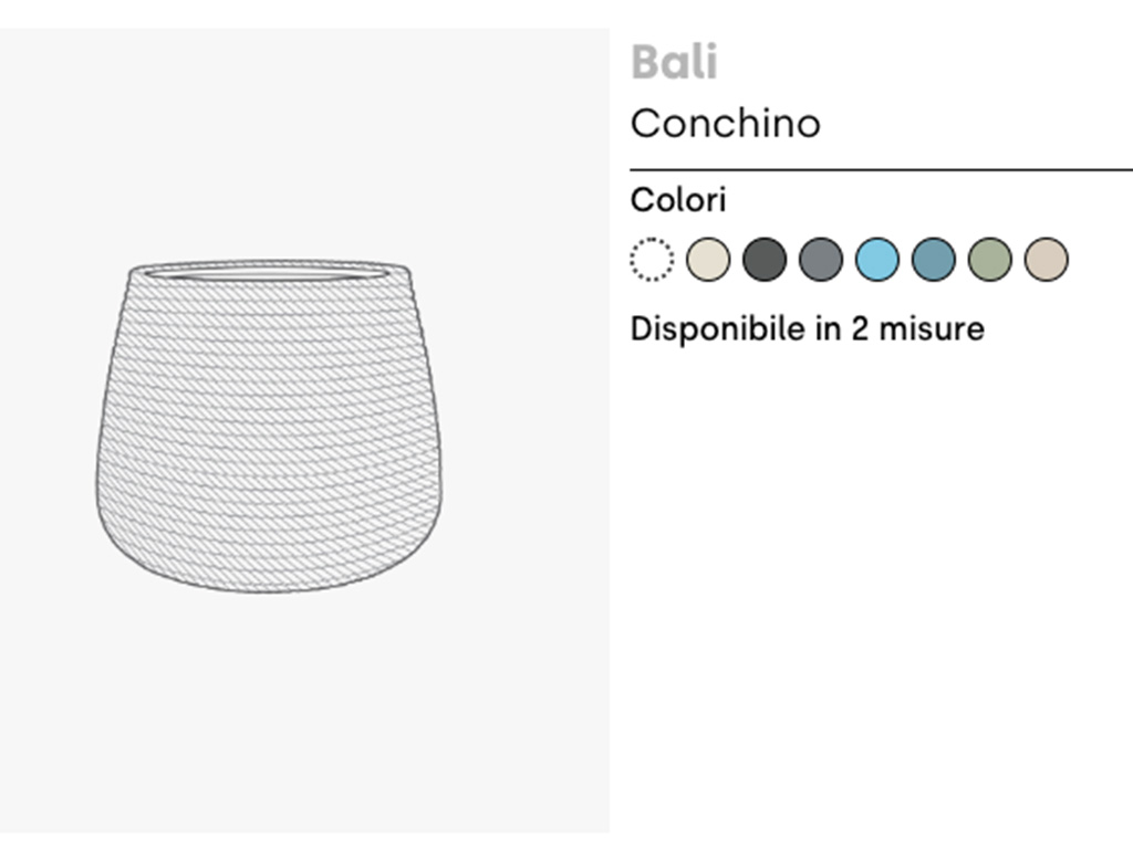 Con la sua forma arrotondata e l’effetto intrecciato della superficie, Bali Conchino rappresenta una delle soluzioni più ricercate tra i vasi moderni da interno. L’uso del polipropilene lo rende perfetto per chi cerca un’alternativa ai materiali più pesanti, senza rinunciare a uno stile elegante e sofisticato.