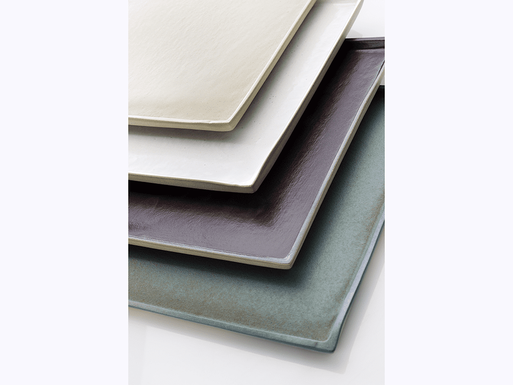 Servizio in ceramica composto da vassoi quadrati di design realizzati artigianalmente in Italia, perfetti anche come piatti da tavola.